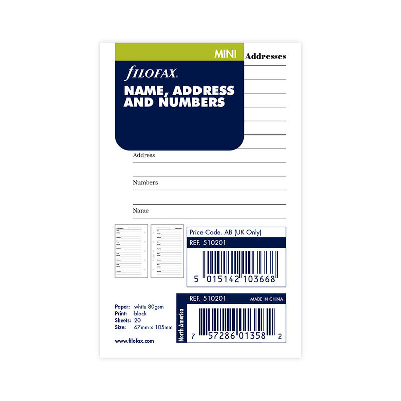 Keep note of your contacts with this name, address and telephone number refill for your Filofax mini organiser. Contains 20 sheets.
