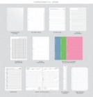 Contents: transparent flyleaf, classic front sheet, six white dividers, four sheets of to-do lists, eight sheets of contacts, eight sheets of ruled notepaper, four sheets of squared notepaper, eight sheets of plain notepaper, twenty four sheets of assorted coloured ruled notepaper, frosted ruler/page marker, top opening envelope