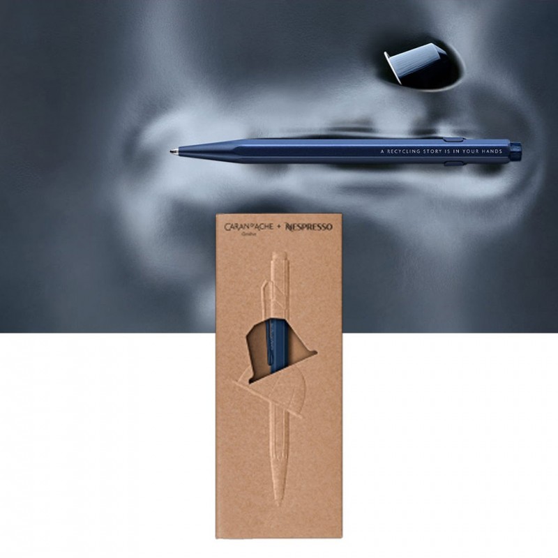Creativity is in the palm of your hand with this new ballpoint pen that unites the worlds of sustainable innovation and artistry. Two iconic Swiss brands, Caran d’Ache and Nespresso, come together once again to create a sleek blue monochrome pen,? made using 14% recycled aluminium from a variety of used coffee capsules. Giving them a second life, and bringing new stories to your coffee moments.