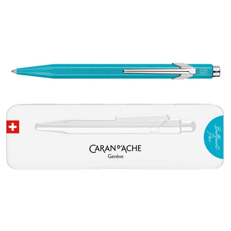 Caran Dache 849 metallic turquoise ballpoint pen, with slim metal box C