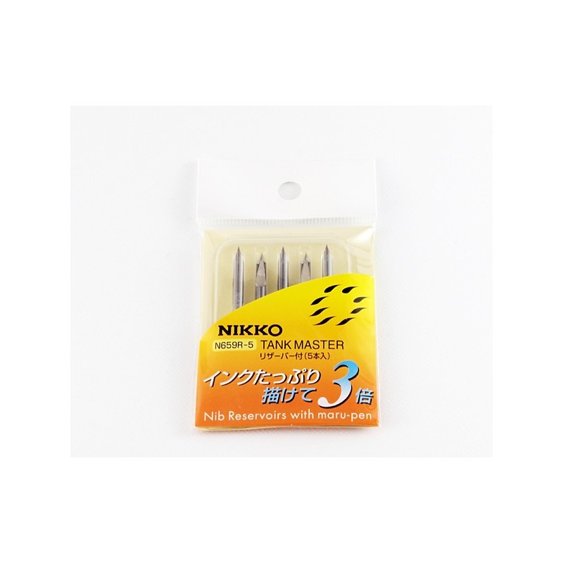 By attaching a special reservoir to the round nib, you can store ink. This significantly extends the writing distance of the round nib (about three times that of a normal round pen). This is a Nikko nib.