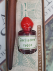 Comes with a glass bottle with red ink and a handle with blotting paper.