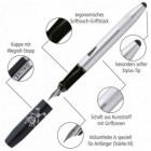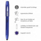 SWITCH- the innovative fountain pen with the App made of extraordinary quality, is equipped with a comfortable ergonomic grip part for classic writing on paper and a nib A with 5 years guarantee. This fountain pen impresses with ist extraordinary soft and comfortable writing experience and ist light weight which is perfectly suitable for continuous writing in everyday school life. The SWITCH fountain pen is as well equipped with a stylus tip which glides lightly and conductively over capacitive screens of smart phones and tablet PCs. The special designed grip ensures a simple handling. Consequently the SWITCH can be used perfectly as a fountain pen for beginners. Made of conductive plastic, the SWITCH serves as a multifunctional writing instrument in school and is suitable for every age group. But the SWITCH can do more: It’s the first pen with a free App for writing exercises on tablets. ONLINE developed together with teachers this App for writing, letter and word exercises.
