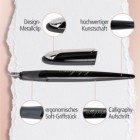 This high-quality fountain pen is ideal for creative writing and designing in school exercise books, on greeting cards, certificates etc. The high-quality iridium calligraphy nib – each one tested individually for quality – in size 1.4 mm enables you to create an attractive and individual impression. The 5-year guarantee stands for sustainable, meticulous quality of the writing instrument, which is emphasized by the sturdy metal clip.