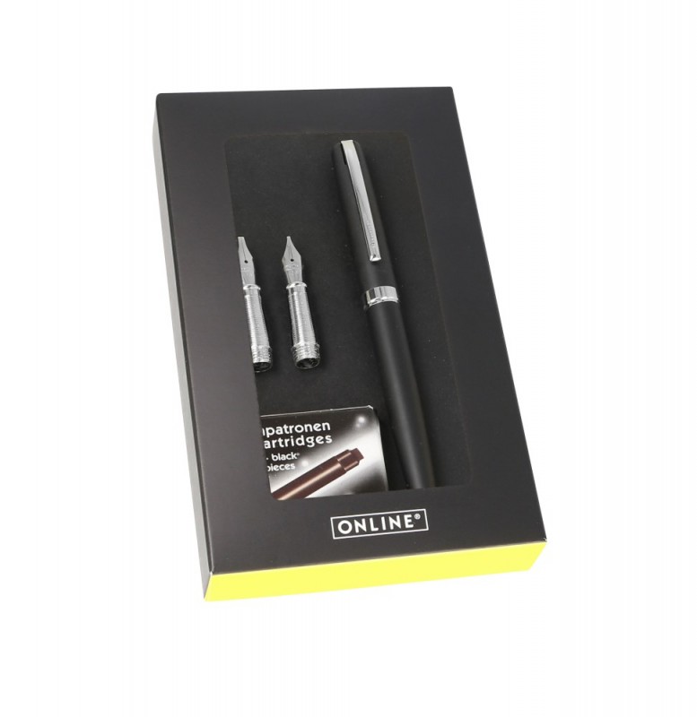 This ONLINE design metal fountain pen is equipped with three high-quality nibs and offers the highest level of writing. Delivered in the stylish box, every writing instrument is an elegant gift. Standard cartridges, converter possible; ONLINE grants a 5-year warranty on the iridium nib.