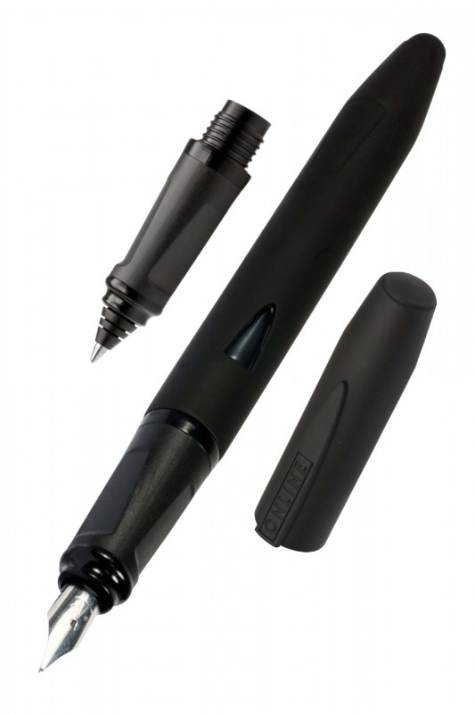 Featuring a trendy design, both the robust rollerball and the sturdy fountain pen with elegant iridium nib A (for beginners) guarantee a fluid writing style, even in continuous use. Standard cartridges ensure cheap and simple refills. Each individual pen represents tested quality.The SWITCH is as well equipped with a stylus tip which glides lightly and conductively over capacitive screens of smart phones and tablet PCs. The special designed grip ensures a simple handling. Consequently the SWITCH can be used perfectly as a fountain pen for beginners. Made of conductive plastic, the SWITCH serves as a multifunctional writing instrument in school and is suitable for every age group. But the SWITCH can do more: It’s the first pen with a free App for writing exercises on tablets. ONLINE developed this App together with teachers for writing, letter and word exercises.