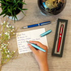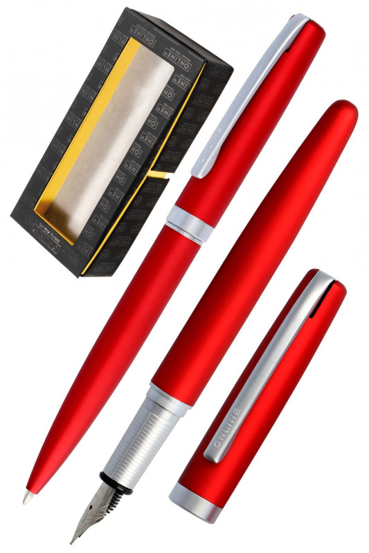 The ONLINE Eleganza set consists of a fashionable Eleganza metal fountain pen with standard cartridges or converter and an Eleganza ballpen which contains a black king size standard refill. This set offers the highest level of writing.