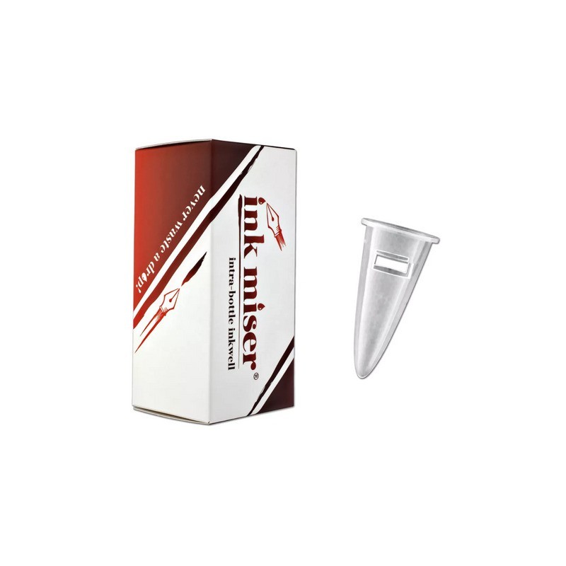 The Intra-Bottle Ink Miser insert fits inside a glass or plastic fountain pen ink bottle with an approximate capacity of 90 ml. It is very easy to use: simply replace the cap, quickly turn the bottle upside down a few times, remove the cap, and fill your fountain pen as usual. Ink bottle not included.