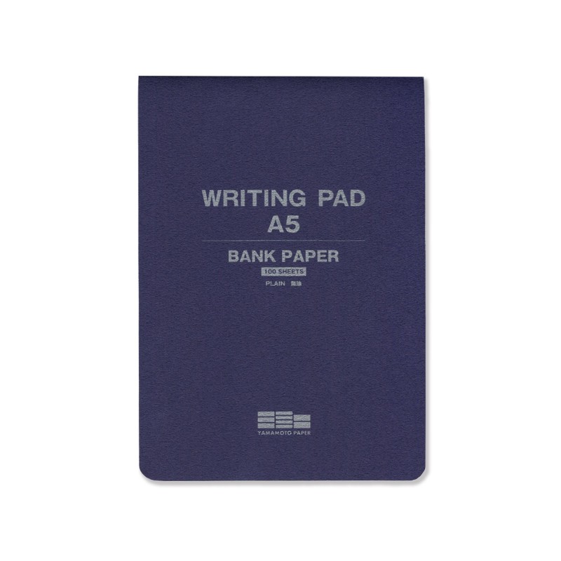 WRITING PAD A5 / BANK PAPER Size: 148 x 210 mm Number of sheets: 100 Paper: Bank paper Ream weight: 66.3 g/㎡ A5 size with ruled underlay Bank paper is a writing paper developed by Mitsubishi Paper in 1960 as bank ledger paper.
