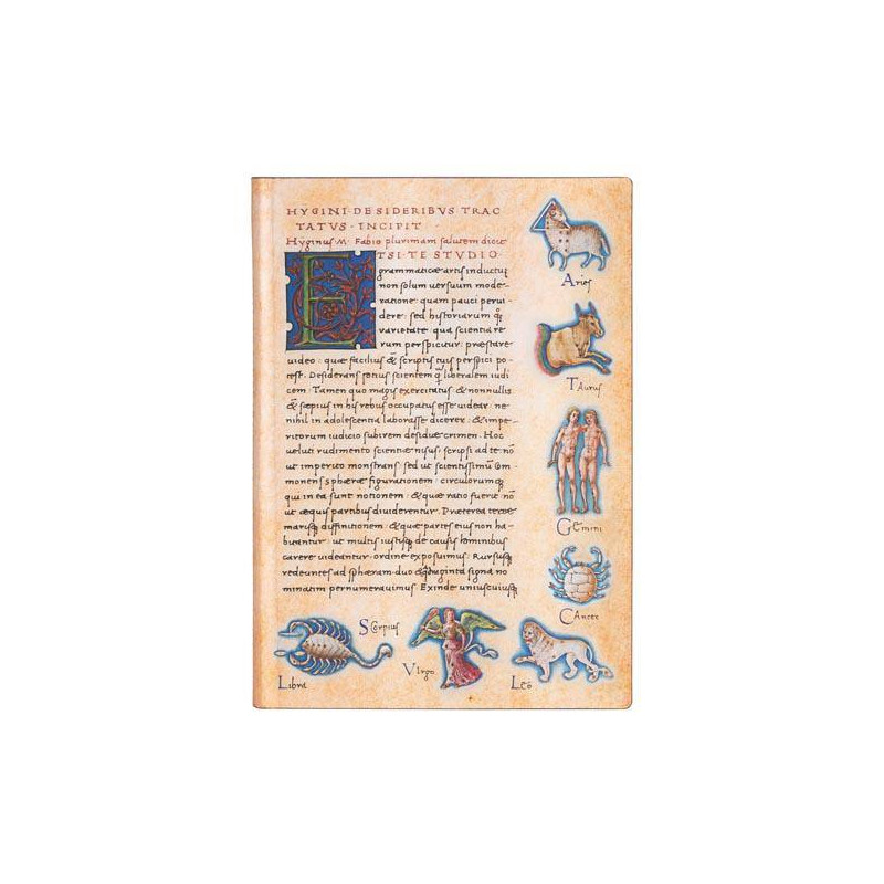 Decorative printed cover paper Discover the ancient Roman legends of the constellations with this intriguing journal cover. Reproducing images from De sideribus tractatus, a 15th-century manuscript copy of a treatise on astronomy known as De astronomia, this fascinating design is now a part of The New York Public Library’s Spencer Collection. The original De astronomia is most commonly believed to have been composed late in the 1st century B.C. by C. Julius Hyginus, a freedman of Augustus Caesar and chief librarian of the then recently established Palatine Library in Rome. The original is long lost. Over the centuries, manuscript copies of the treatise were created in order to preserve Hyginus’ words and reflections. The work was transmitted by scribes who painstakingly reproduced the original text, word by word and copy by copy, and artists called miniaturists who supplied the appropriate illustrations in each. Today, only 88 manuscript copies survive, the earliest dating to the 9th century. De sideribus tractatus itself is dated to circa 1475–1480 and named for the recognizable words written in capital letters at the beginning of the text: “Hygini de sideribus tractatus incipit,” meaning “Here begins the treatise of Hyginus on the constellations.” Over the years, the work has also been referred to as “Poeticon Astronomicon” (used in the first illustrated printed edition) or “De imaginibus coeli,” as well as “Poetica astronomica,” from which we have taken our journal title: Astronomica. The text of this manuscript copy is believed to have been inscribed for his own use by Francesco Buzzacarini (ca. 1440–ca. 1500), with artwork attributed to Giovanni Vendramin and an otherwise anonymous miniaturist known as the Douce Master. Their artwork is, in fact, what makes De sideribus tractatus such an exceptional copy of De astronomia. The quality of detail and additional artistic flourishes in this manuscript cause it to outshine nearly every other known manuscript copy of Hyginus’ work. The illuminated manuscript known as De sideribus tractatus is featured in the new Treasures of The New York Public Library exhibit. We are honoured to partner with the Library to bring this fascinating document to our Paperblanks collection.