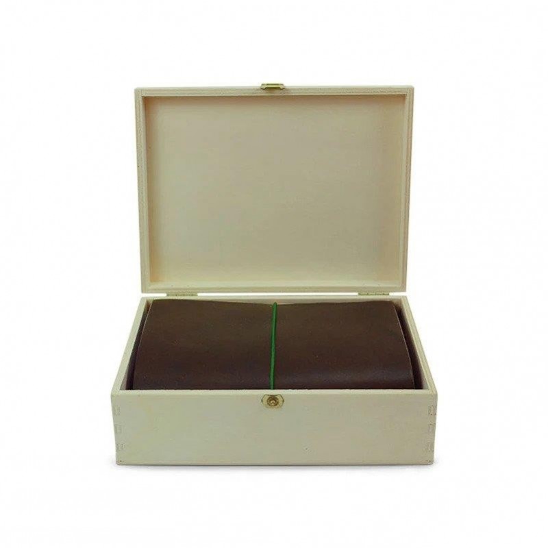 It includes a grand voyageur pocket (15 x 10cm) with four refill notebooks, a card holder and a ribbon kit , which we pack with care in a beautiful wooden box (17x13x6 cm) from Austria.